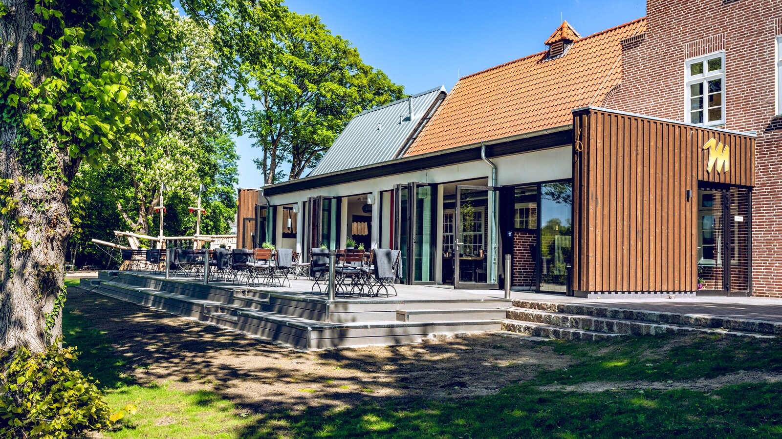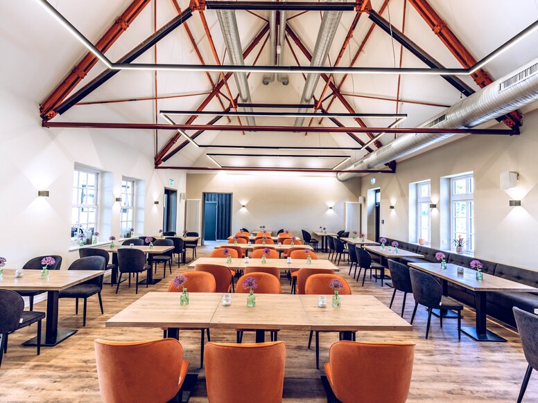 AX5 carefully renovated the main building, which is protected as a unique cultural monument, and rebuilt it to meet the standards of a modern restaurant. The large hall in the main building was preserved and fixtures from more recent times were removed. AX5 had an extension from the 1960s demolished and replaced it with a new extension that also houses the sanitary facilities. The new building is designed as a contemporary wooden structure, which was added to the gable end of the hall.
