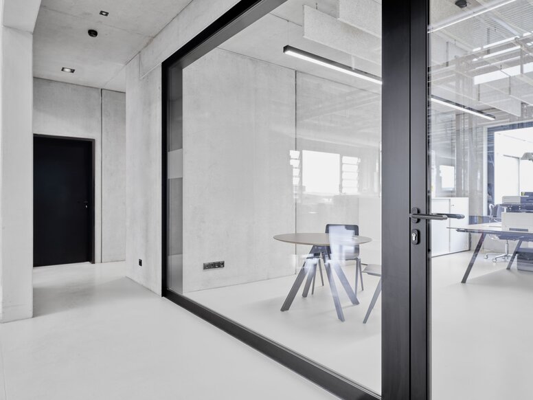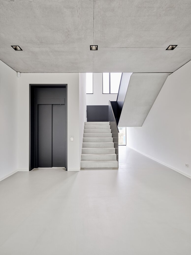 In the interior, the architects have implemented clear design principles on a completely continuous basis. The entire production hall shines in an almost sacred-looking white. “We even had the industrial crane painted white,” explains architect Prof Alexandra Röing, known as Nölke, and continues: “We deliberately opted for an alternative to the restless atmosphere usually found in workshops and production halls.” The other colours and materials also create clarity. White characterises the production, while exposed concrete surfaces and black elements give the administrative wing a uniform, restrained and elegant appearance.