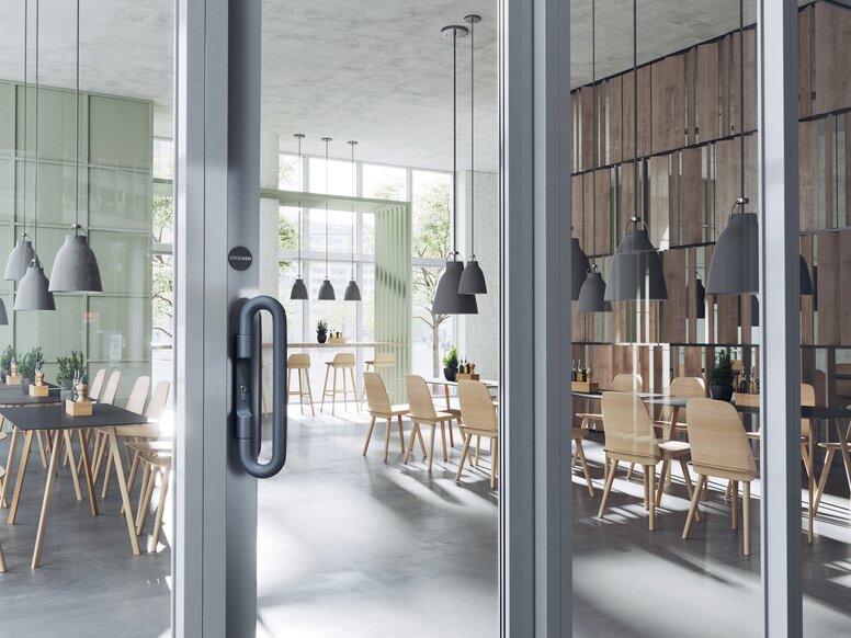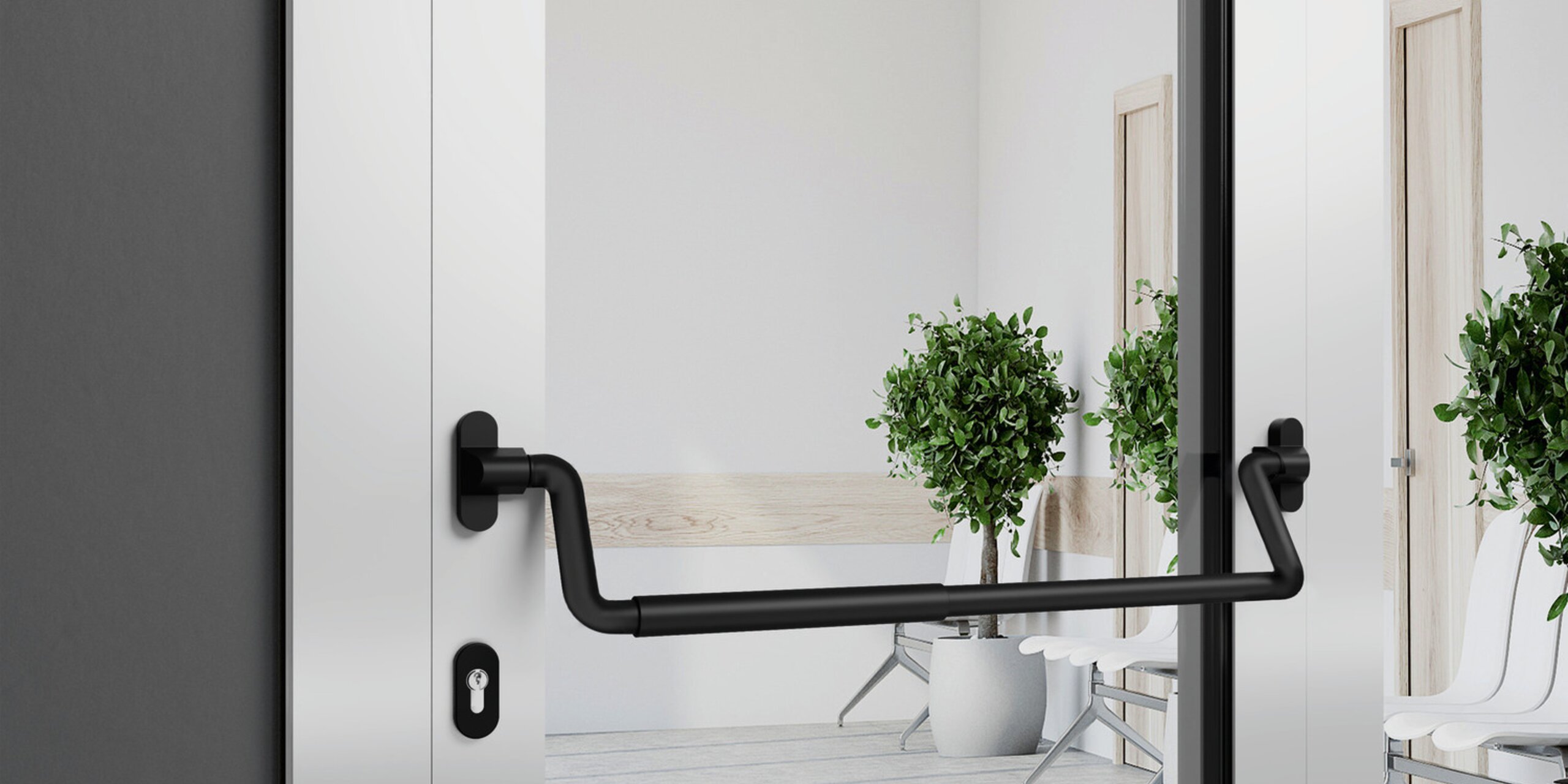 Vision decreases significantly with age and thus represents a disability for broad sections of the population. In order for people with poor eyesight to find their way around buildings, information must be presented in high contrast and according to the two-sense principle. With the panic bar, operation is conveyed via two senses: the doubled handle area made of coloured polyamide visualises the handling and can also be sensed by touch. The door opens when pressure is applied against the horizontal operating rod. By marking the optimum pressure point according to the two-sense principle, the panic bar meets the requirements of DIN 18040 for barrier-free construction.
