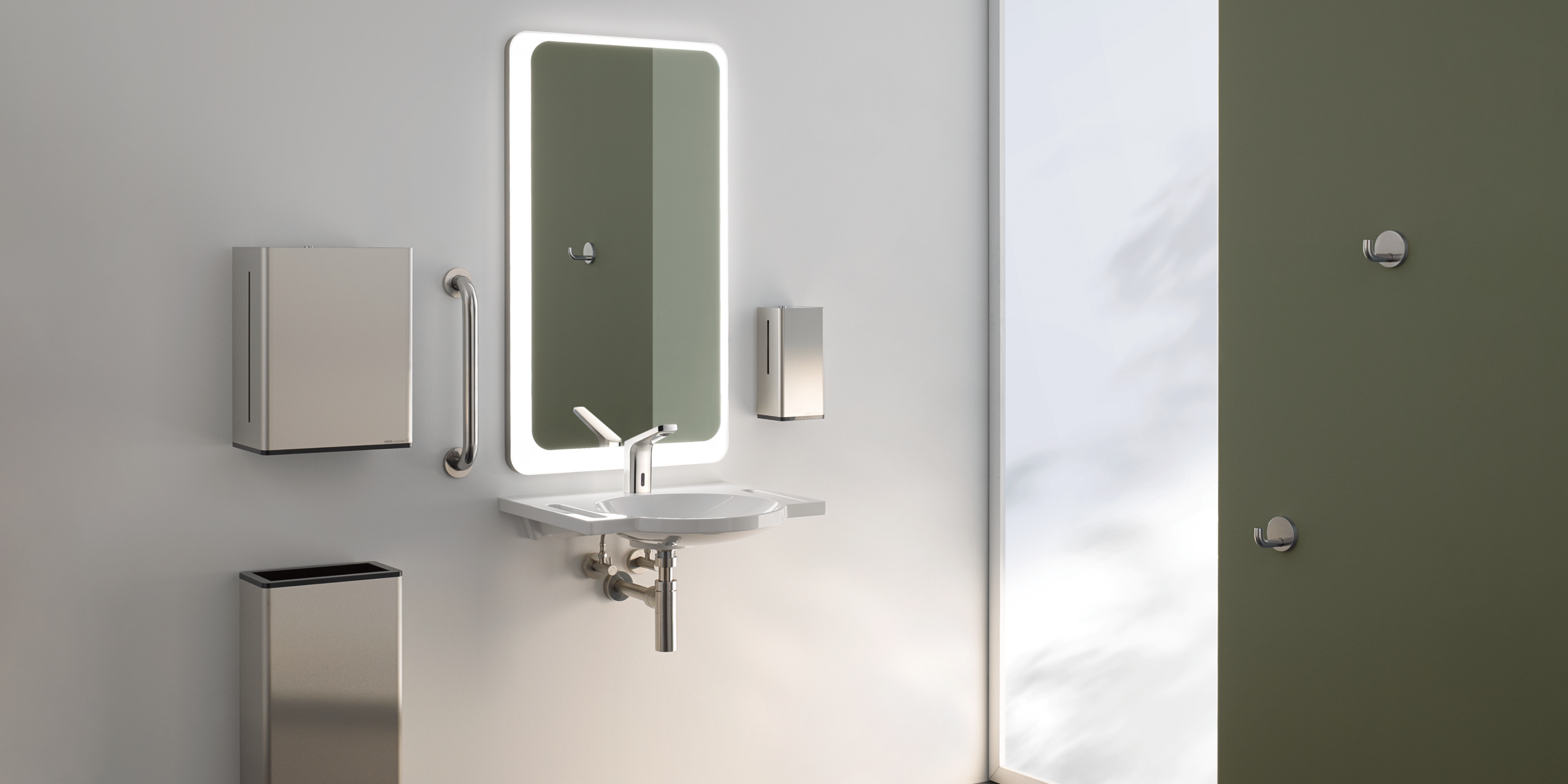 • From washbasins and accessories to fittings, hinged support rails and seats