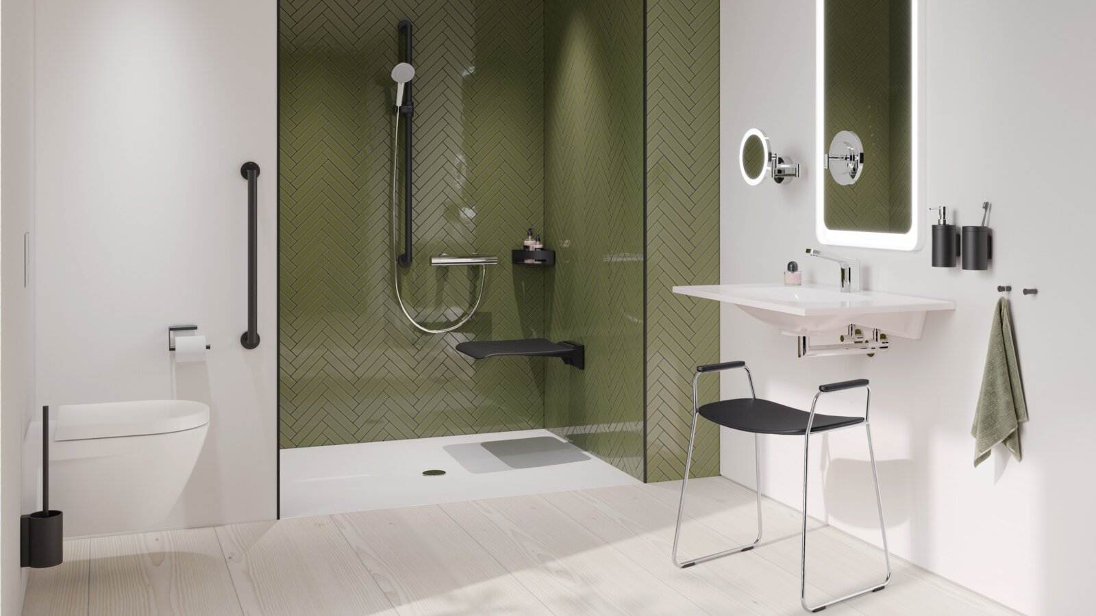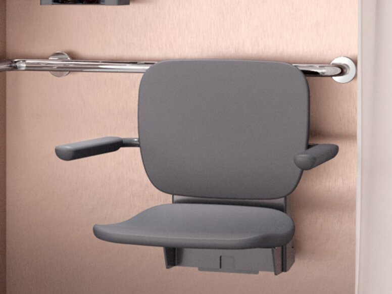The mobile seat allows the shower to be flexibly equipped. If required, the mobile shower seat is simply snapped into the permanently installed mounting plate.