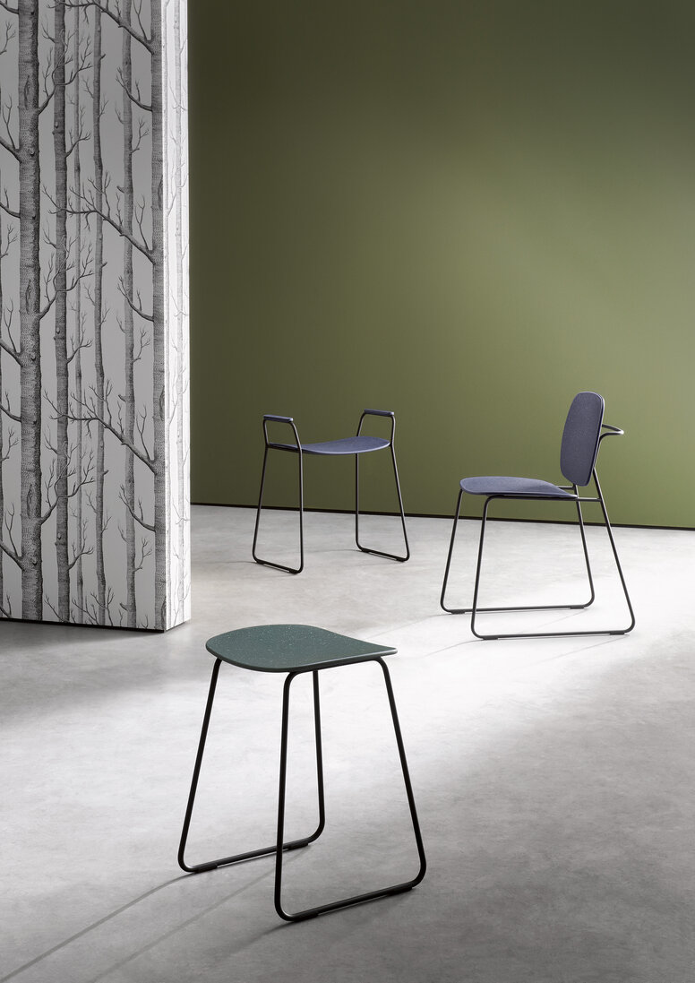 The material blend of recycled polypropylene and recycled polyamide gives the lightly speckled surfaces a vibrant and individual look with their unique patterns and translucent spots of colour. The use of recycled material not only reduces plastic waste, but also makes each seat and armrest a one-off.